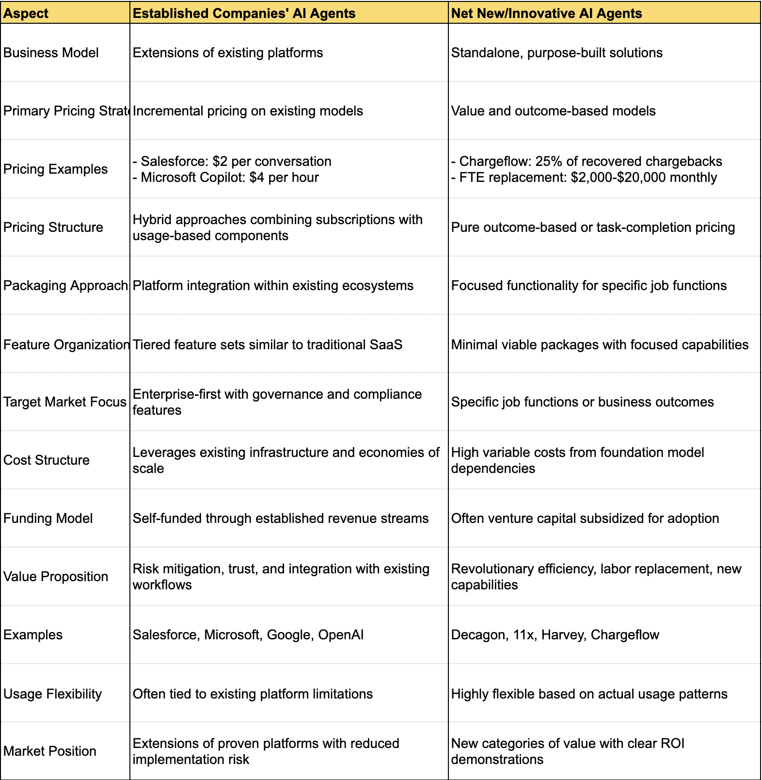 Comparing pricing and packaging strategies of new agents vs. agents built on top of existing applications.