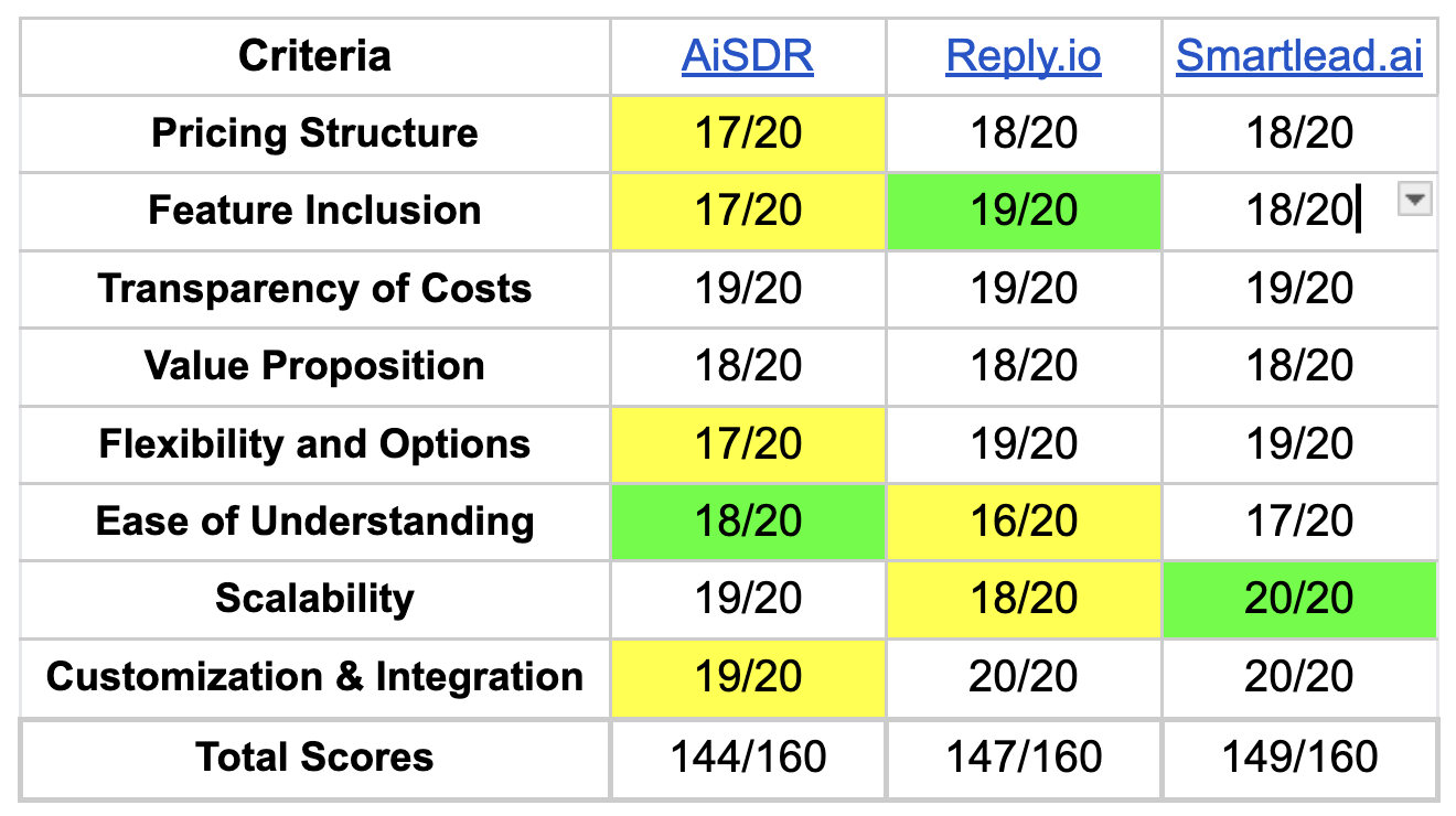 In this post, we’ll dive deeper into the unique selling points and pricing structures of three leading AI SDR platforms: AiSDR, Reply.io, and Smartlead.ai. This comparison will help you understand which tool best aligns with your business needs, using a detailed rubric to evaluate their pricing and features.