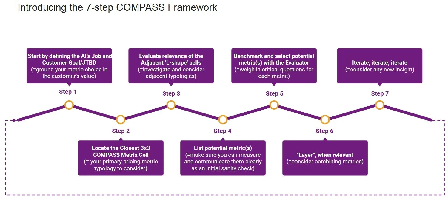 At its core, the COMPASS framework begins with a 3x3 matrix that maps pricing metric typologies along two critical axes: the scope of the agent’s work (from simple tasks to autonomous goal achievement) and the level of attributability (how directly the agent’s actions can be linked to business outcomes). This matrix helps companies pinpoint whether their optimal pricing metric should be based on agent access, activity, output, or outcomes—each representing a different alignment with value creation and customer expectations. The framework then guides teams through a seven-step process: starting with defining the agent’s job-to-be-done, mapping to the right metric typology, considering adjacent options, listing and benchmarking potential metrics, layering multiple metrics if needed, and iterating as the solution and market evolve.