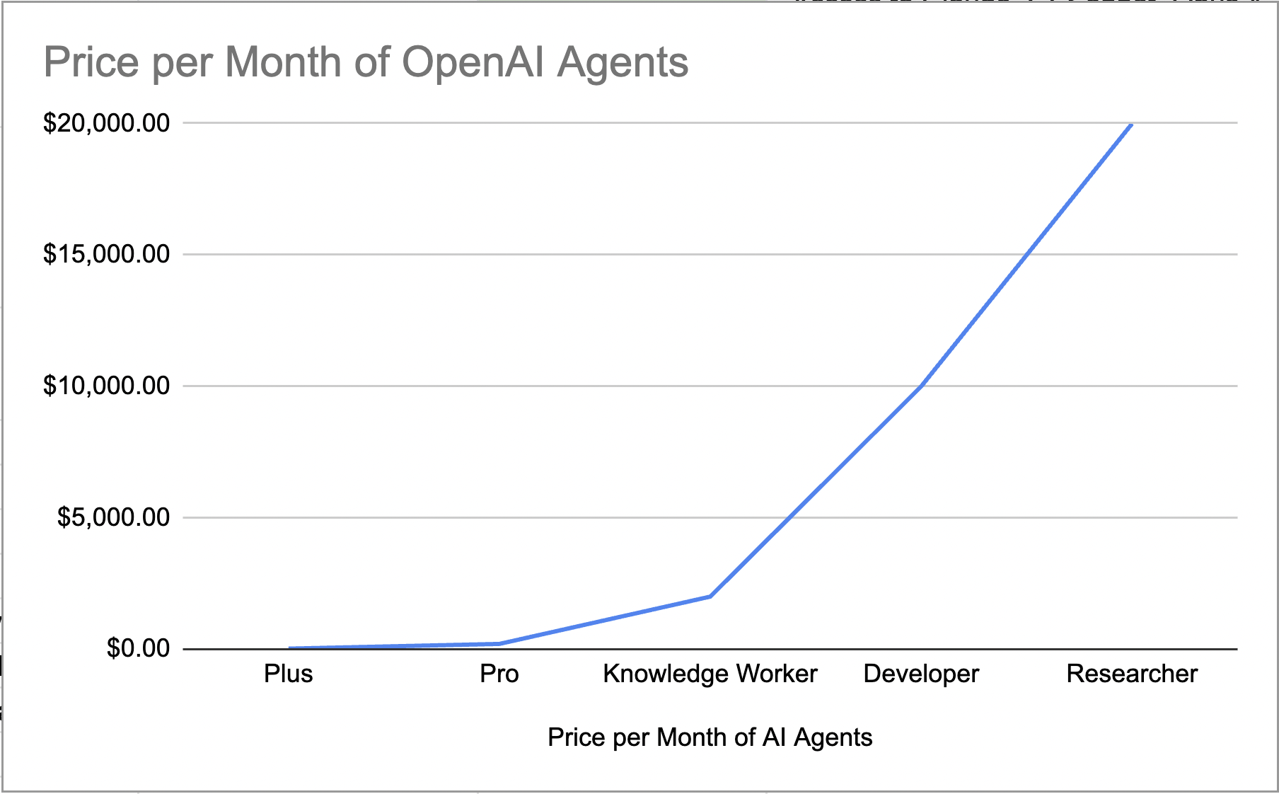 One question many are asking is how this framing by OpenAI will impact their own pricing. Has OpenAI set a price ceiling (currently at $20 for most agents, perhaps at $200 for the most advanced agents) or is it possible to reach higher price levels?