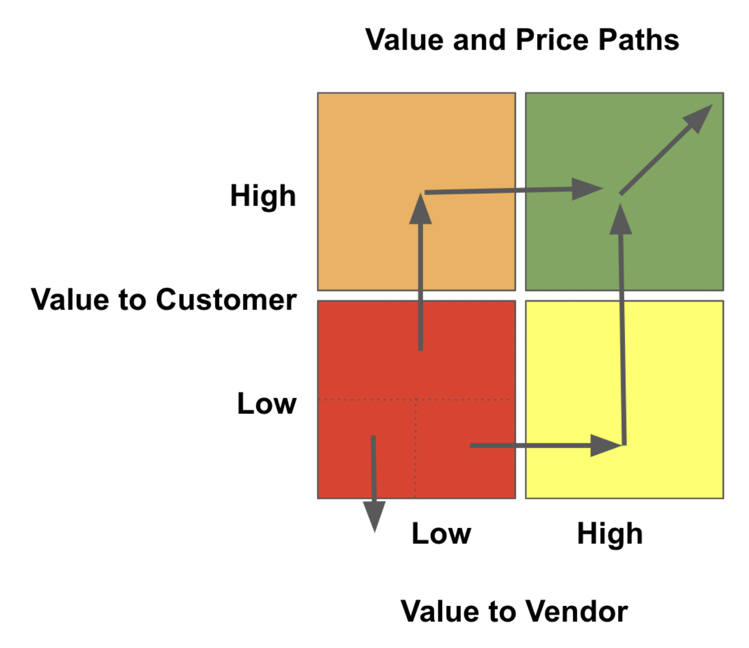 You have some customers for whom you provide relatively low value to customer (V2C) and who have a relatively low customer lifetime value. In many cases it is OK to lose these customers. They are a drag on your business. You are better off dropping the customers in the bottom left corner of the value and pricing paths map.