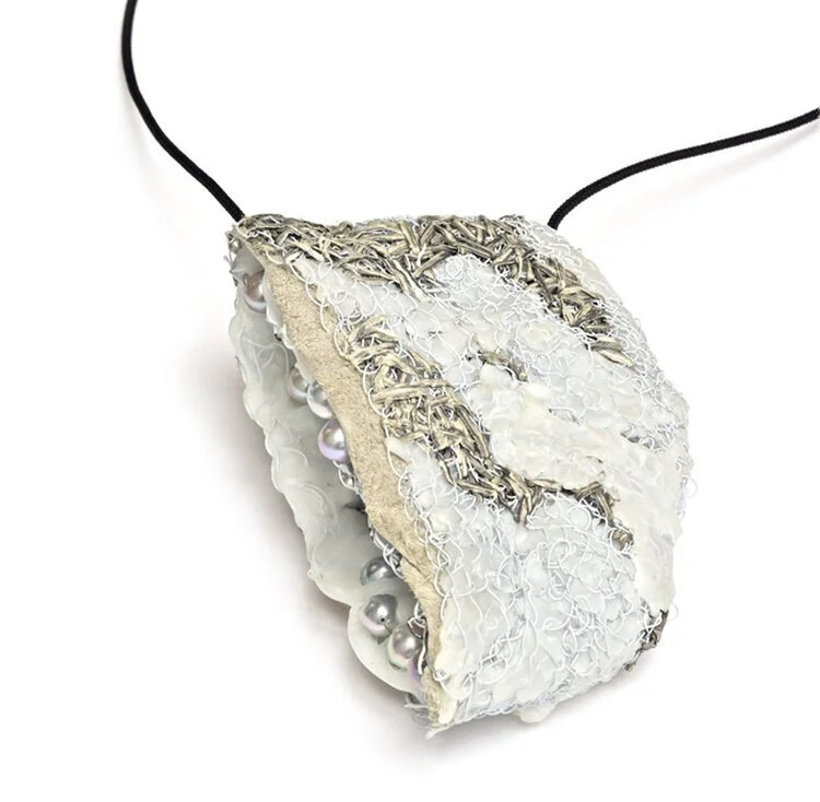 Art jewelry is altogether different. This work is quirky and unique. It is often made from cast off bits and pieces, the flotsam and jetsam of the modern world (bits of wire, broken ceramics, flakes of rock, melted plastic cups, industrial paper). It is formed into jewelry in many different ways. Sometimes traditional metallurgy techniques are used, but so are crocheting and knitting, moulding, assemblage and just about anything else that will cause different types of materials to stick together.