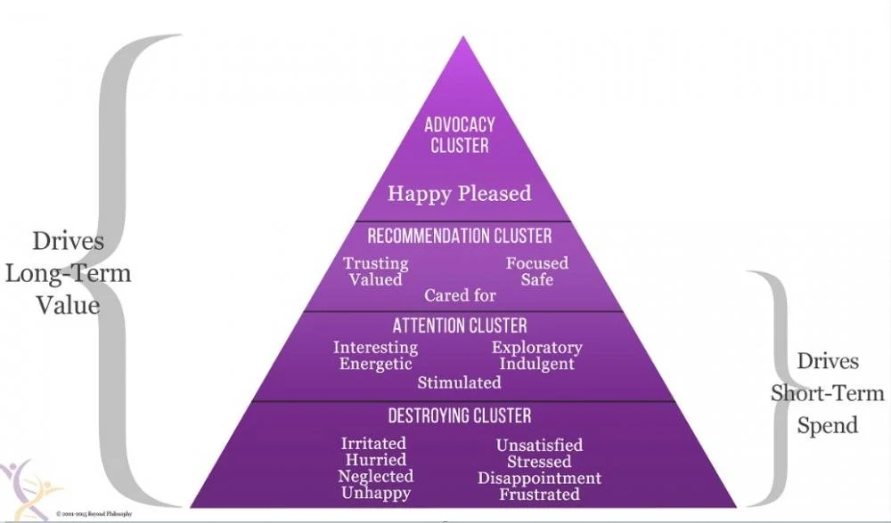 Colin Shaw is the author of the best-selling book The DNA of Customer Experience: How Emotions Drive Value. The baseline model he presents contains 20 emotions organized into four groups, or clusters, as he refers to the groupings. The bottom section, called the Destroying Cluster, contains the following emotions: Irritated, Hurried, Neglected, Unhappy, Unsatisfied, Stressed, Disappointed, and Frustrated. One level above sits the Attention Cluster, which comprises five emotions: Interesting, Energetic, Exploratory, Indulgent, and Stimulated. Now, we are moving toward the most desired cluster - the Recommendation Cluster (Trusting, Valued, Focused and Safe), while the top of the pyramid includes only two emotions: Happy and Pleased under the umbrella of the Advocacy Cluster. According to Shaw, the whole set drives the long-term value while the bottom 2/3 drives the short-term spend, which occupies the lower two clusters.