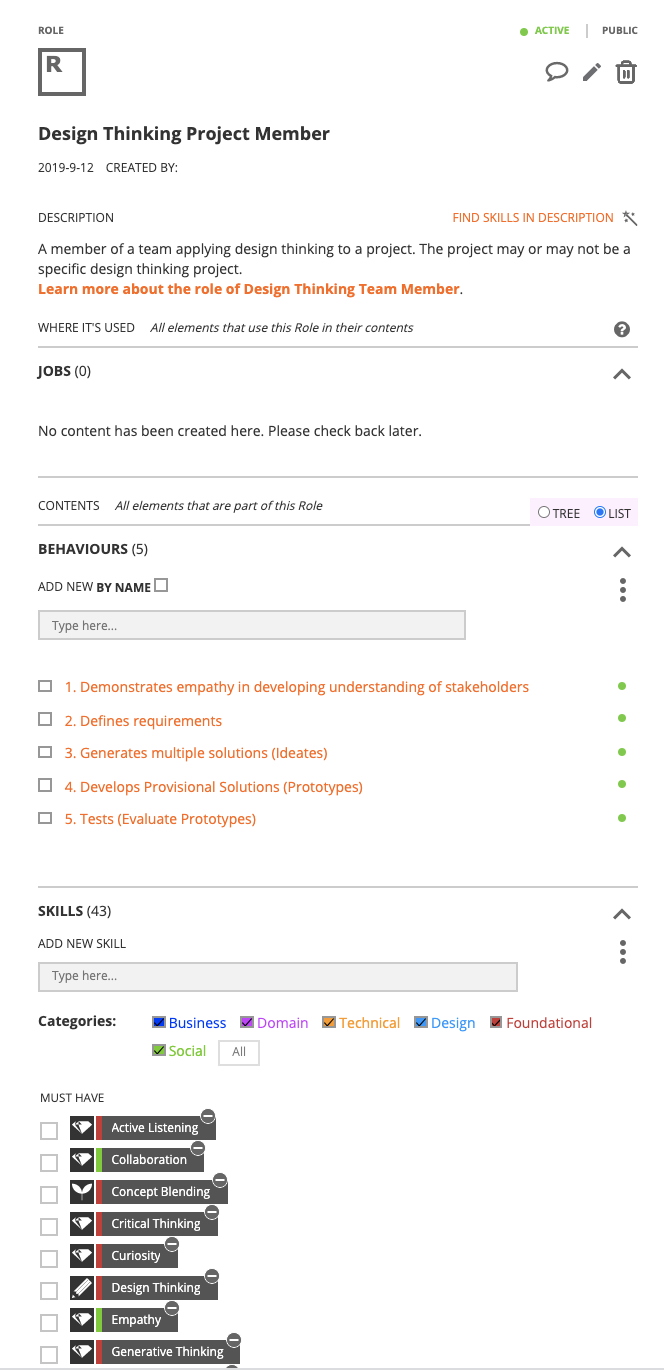 For example, a competency statement for the role of design thinking project member might look like the below screenshot (this is taken from Ibbaka’s Open Competency Model for Design Thinking).