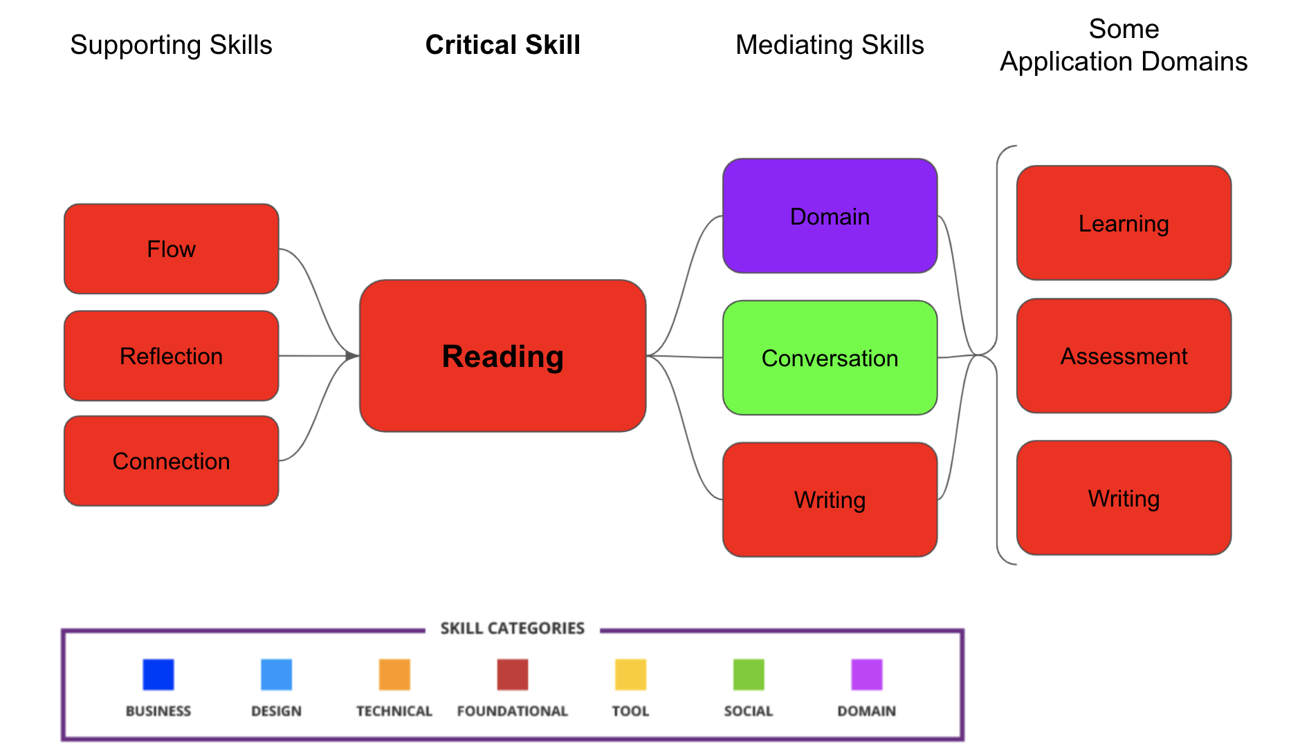 Note that Writing, a foundational skill closely associated with Reading, shows up both as a mediating skill (a skill that helps one apply a critical skill) and as one of the applications of the critical skill of reading. These paired skills - reading and writing, making abstract and making concrete, talking and listening - are some of the most important relations in the skill graph and are something we are working to understand better.
