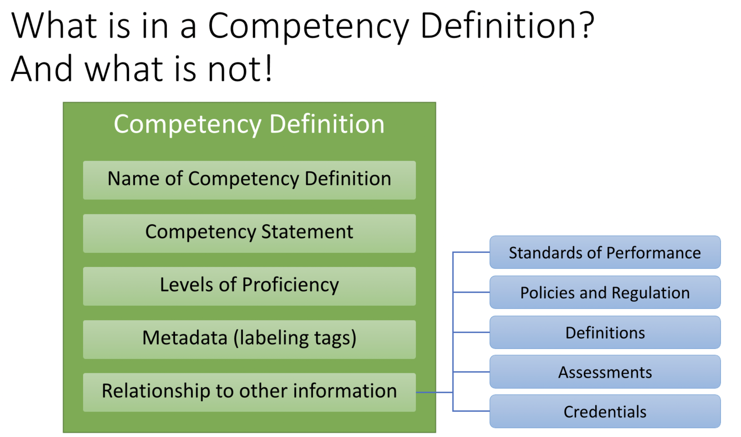 Competency definitions can connect to other things, such as Standards of Performance, Policies and Regulations, Definition, Assessment, Credentials other other things (at Ibbaka we frequently connect them to Roles and to Goals)