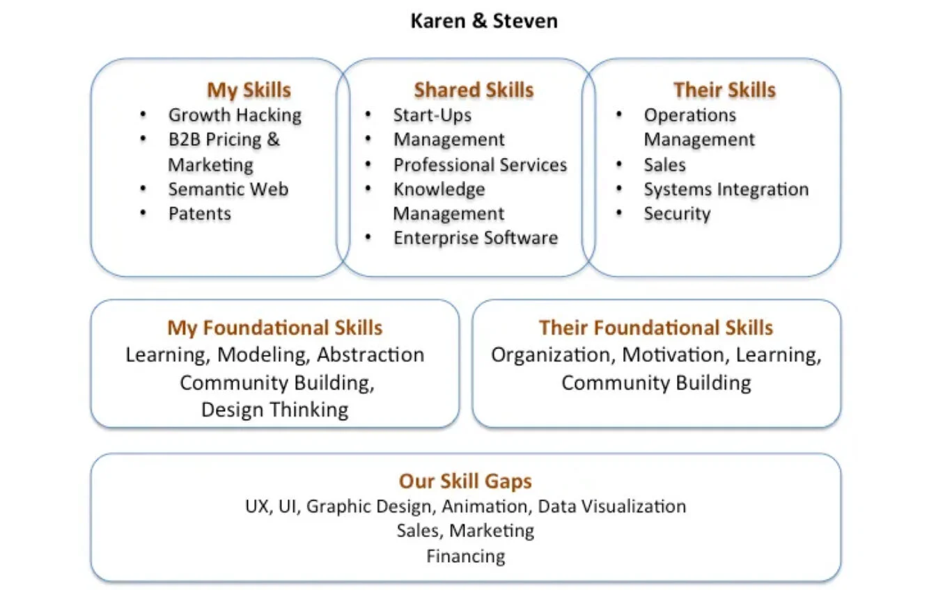 We can break this down into four sets of skills: the skills we share, the skills each of us has that complement the other and the skills we lack. To round things out, it is really useful to understand each other’s foundational skills – the skills that our other skills are based on.