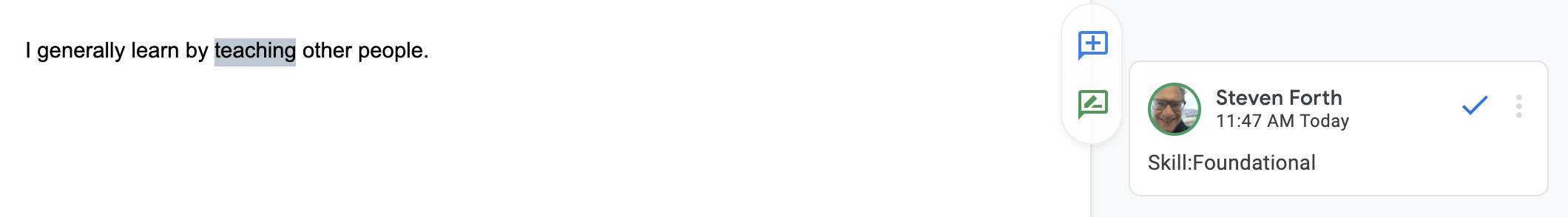 “I generally learn by <skill:foundational>teaching</skill> other people.”