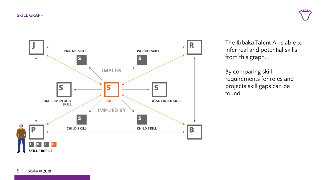 Under the hood, skills get connected through the skill graph. The skill graph is a data structure that underlies skill management. It connects skills, people, roles, goals in a way that supports all sorts of advanced functionality, from search, to skill extraction from unstructured documents, to suggesting skills to individuals and for roles and teams.
