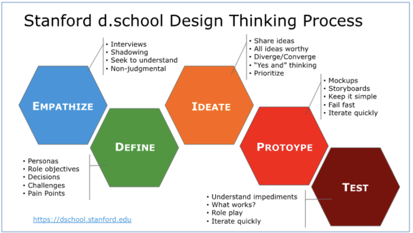 Design Thinking is a process for generating and testing innovative solutions that was popularized by the Stanford University d.school and the Hasso-Plattner-Institute. It was formalized at the well know design consultancy IDEO. actually goes by various names, all of which connote a slightly different approach to what is essentially the same discipline.