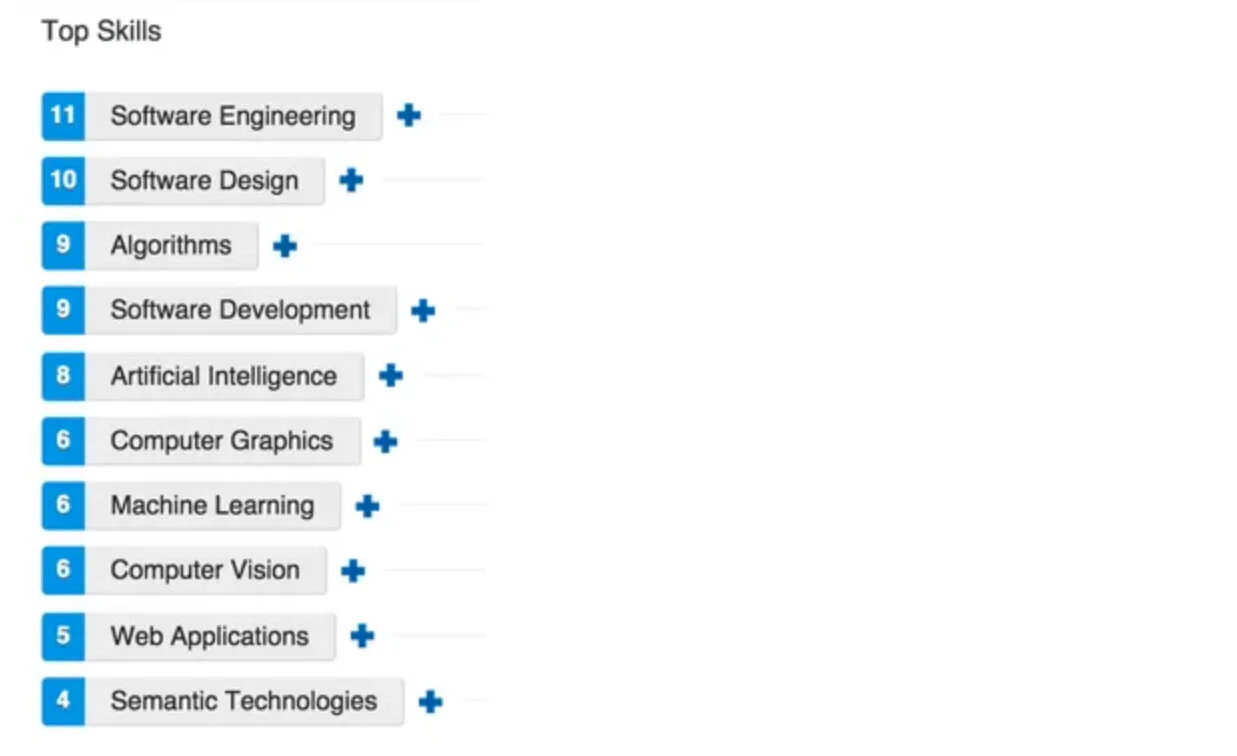 But most people care about the skills you have used most recently. TeamFit will tell you this. Looking at TeamFit CTO Lee Iverson, we can see that his top ten skills on LinkedIn are as shown below.