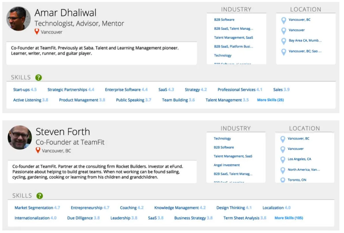 It is interesting how different the TeamFit and LinkedIn skills profiles are. The TeamFit profiles are focused and can be linked to actual project work. The LinkedIn skills profiles are more abstract and aspirational. ‘SaaS’ shows up in all four cases. Amar also has overlaps between TeamFit and LinkedIn for ‘Start-Ups’ and ‘Enterprise Architecture.’ For Steven the overlap is ‘SaaS’ and ‘Business Strategy.’