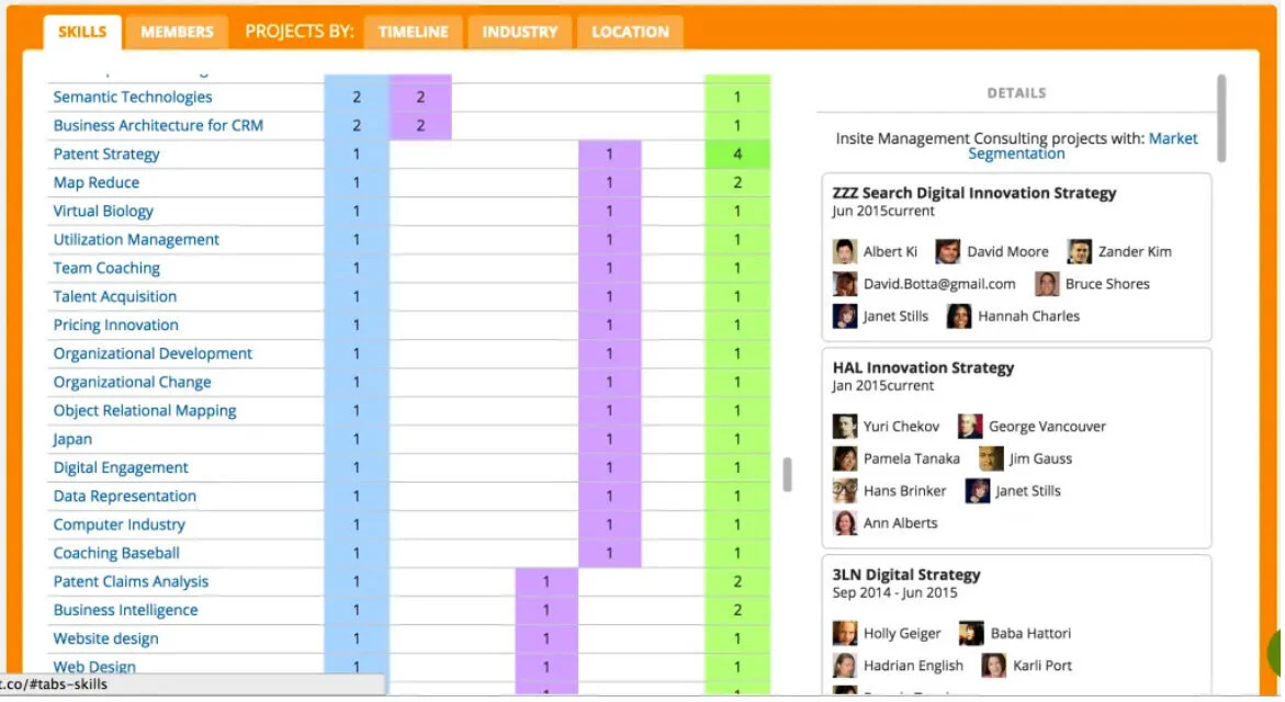 Here is the Skill Map for Insite Consulting (names changed and some data altered). Looking at this, can you guess what kind of work this firm is focused on? Many of their top skills are the ones used in designing go-to-market strategies – market segmentation, marketing strategy, Economic Value Estimation or EVE™. And indeed, that is a mainstay of their business.
