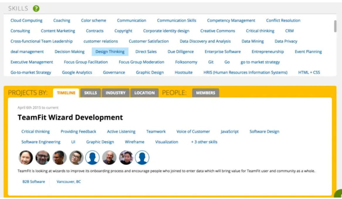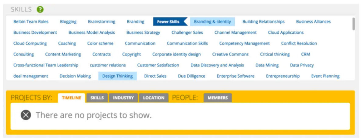 If I want to know who has any combination of skills and what projects they have worked on I simply select the skills I am interested in and I can see everyone who has that combination of skills and what projects they have worked on. Say I work in a digital agency and I am looking for a person in my organization that knows Branding & Identity and Design Thinking.