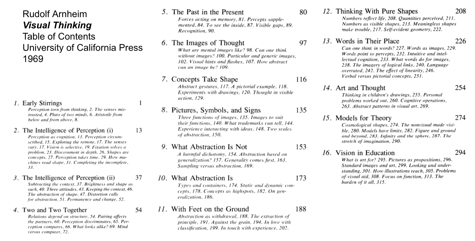 So we can agree that visual communication is a critical skill set. Is visual thinking is also important? I first became aware of visual thinking back in university when I read Rudolf Arnheim’s classic book on the topic. You can read an interesting review of this book by Sergei Mancha here. The table of contents is shown below.
