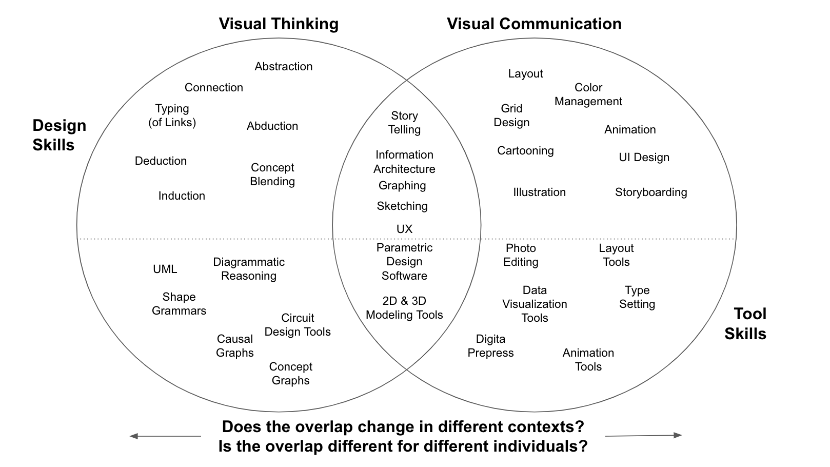 How visual thinking and visual communication skills overlap will differ quite a bit by both individual and context. For most of us, storytelling, a basic part of being human, will show up in both sets. My work skews to planning and strategy, but the projects I work on involve a lot of design and software engineering. That probably accounts for most of my answer (‘there is a small overlap’) and my choice of skills for the Venn diagram.