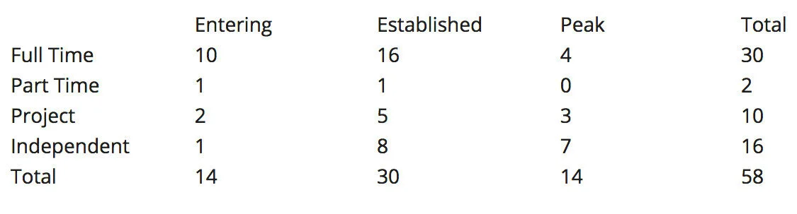 We also asked people about the stage of their career they are at: Entering, Established, Peak (we also had a few responses from people who are preparing to exit the workforce, but we filtered these out).