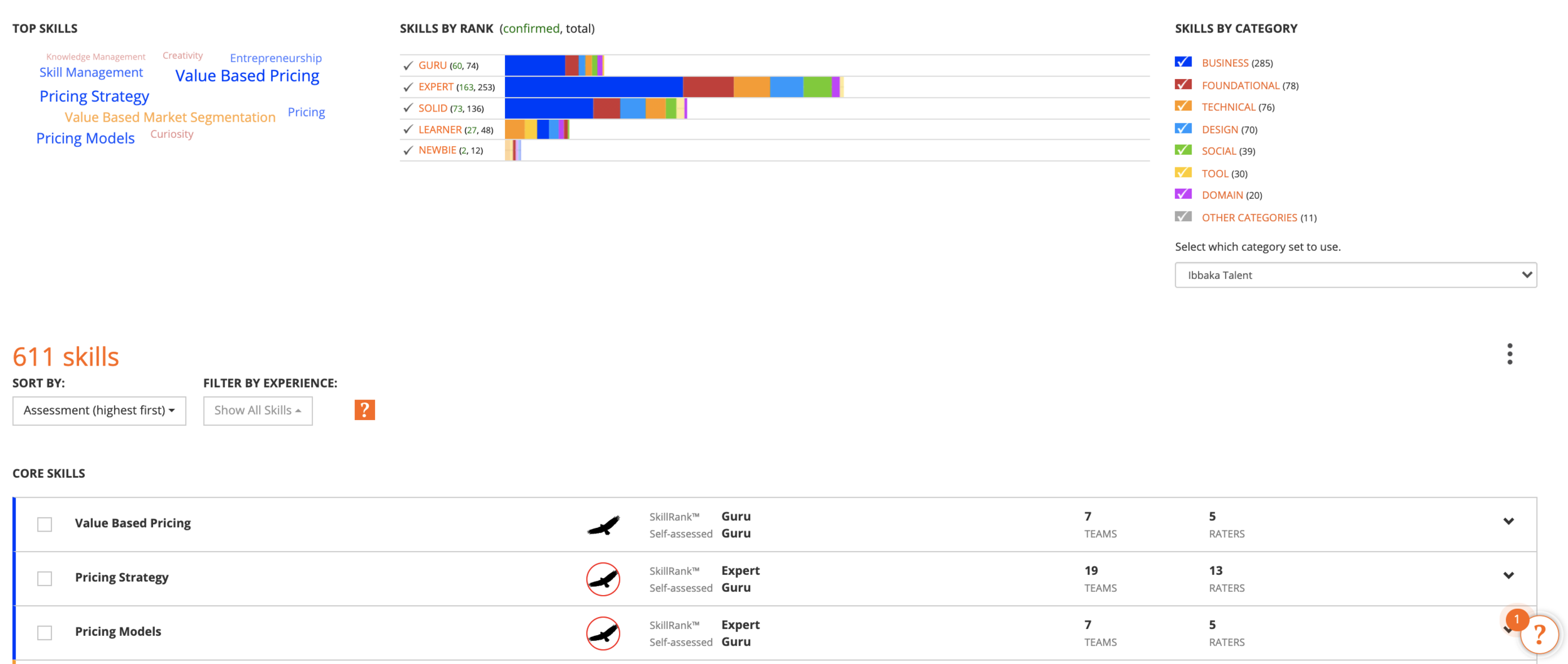Here is an example of an individual skill profile. It includes more than 600 separate skills with estimates of the level of expertise for each skill and a category system to help organize all this data.