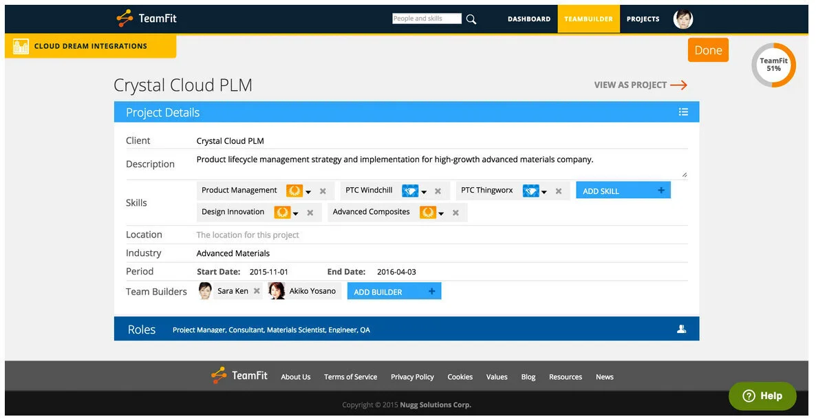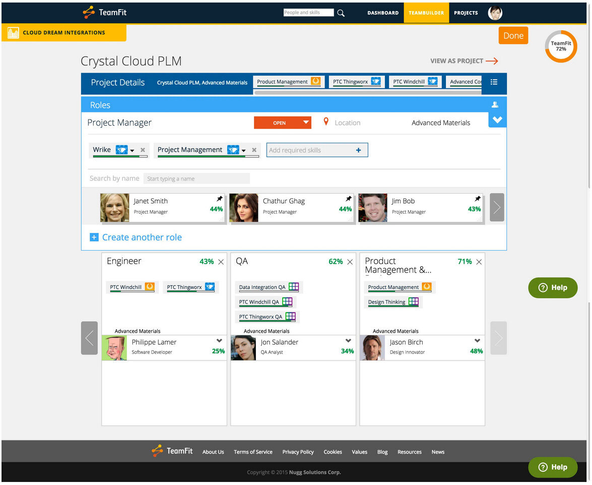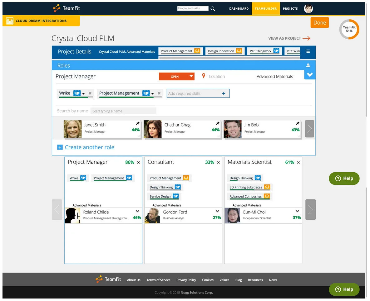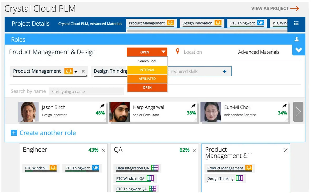 An example, here is a team that a cloud integration company is building for a new project. They will be developing a product lifecycle strategy and implementing a product lifecycle management system (PTC Windchill) for a high-growth advanced materials company.