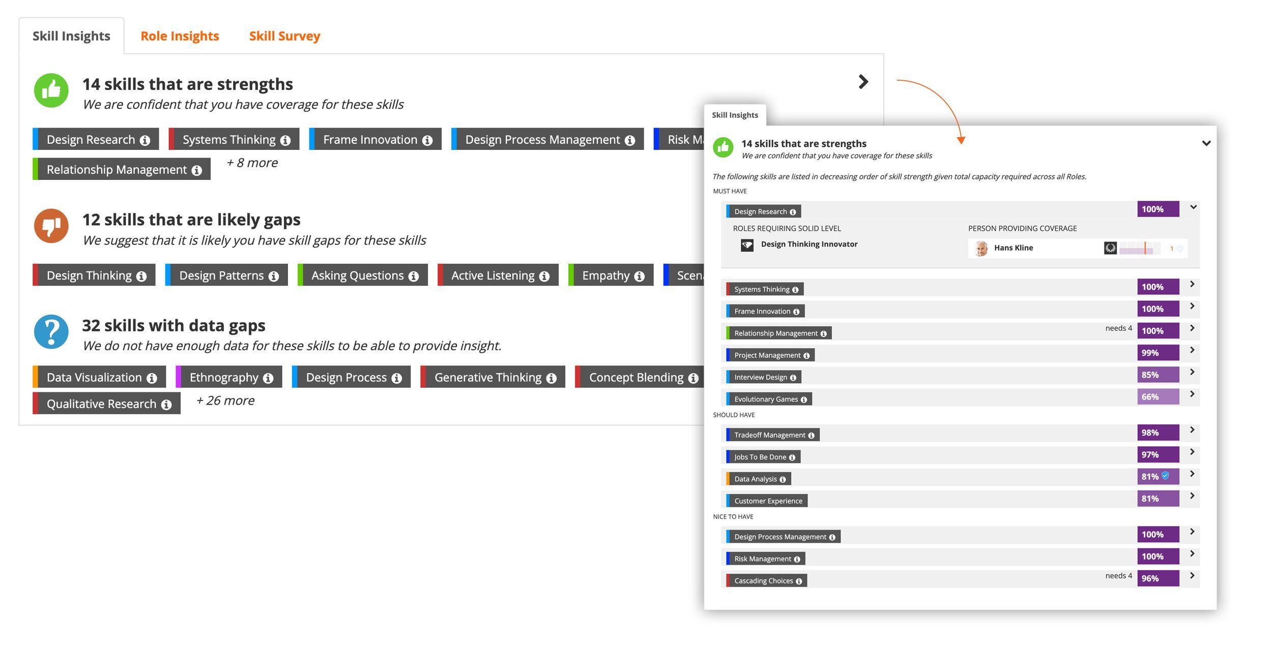 Role Coverage - This is the number of people you have who ‘match’ the skills needed for a role at some minimum threshold, based on self-assessments or peer assessments. This is not just the number of people with a job title. Role coverage extends beyond job titles to give you a clearer picture of people potential in your organization.